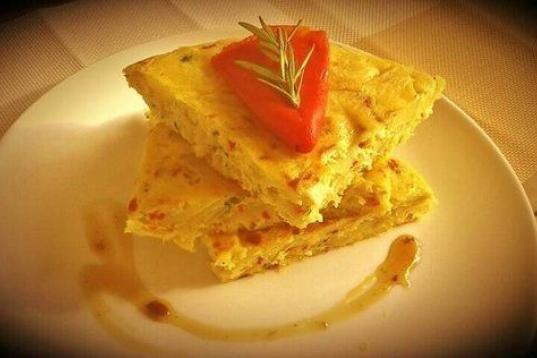 Con huevo, cebolla, patata, bacalao y pimiento del piquillo. Puedes encontrar la receta en Cookpad.