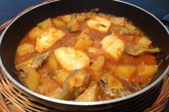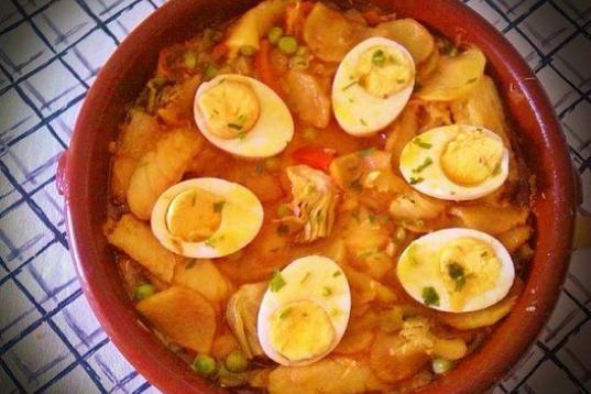 Un clásico con alcachofas, huevos duros, patatas, cebola, pimiento rojo y verde. Mira la receta.