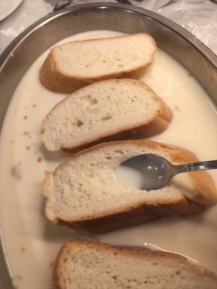 7. Vamos poniendo rebanadas de pan en la leche y las dejamos empapar.
