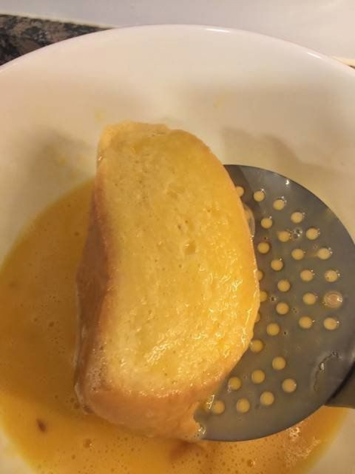 11. Cuando la rebanada esté muy impregnada de huevo, la sacamos.