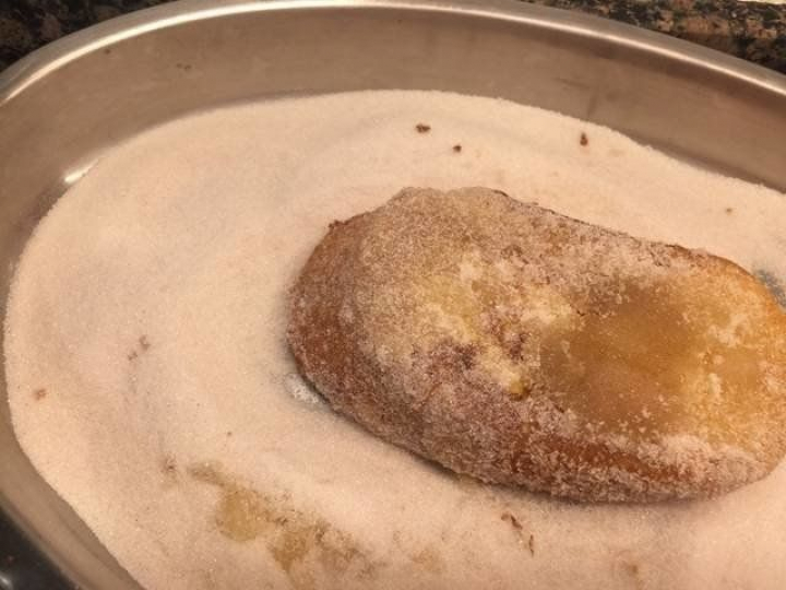 15. Una vez fritas, las iremos sacando de una en una. La ponemos sobre el azúcar con canela y, de nuevo, rebozamos muy bien.