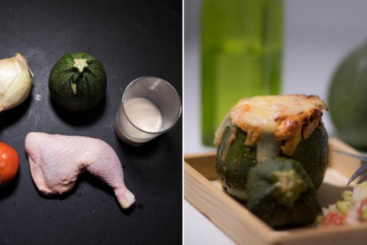 - Cortar la tapa del calabacín y vaciarlo con una cuchara. Disponer la 'carcasa' en un plato al revés, cubrirlo con papel film y meter en el microondas durante 2 o 3 minutos para que se haga ligeramente.