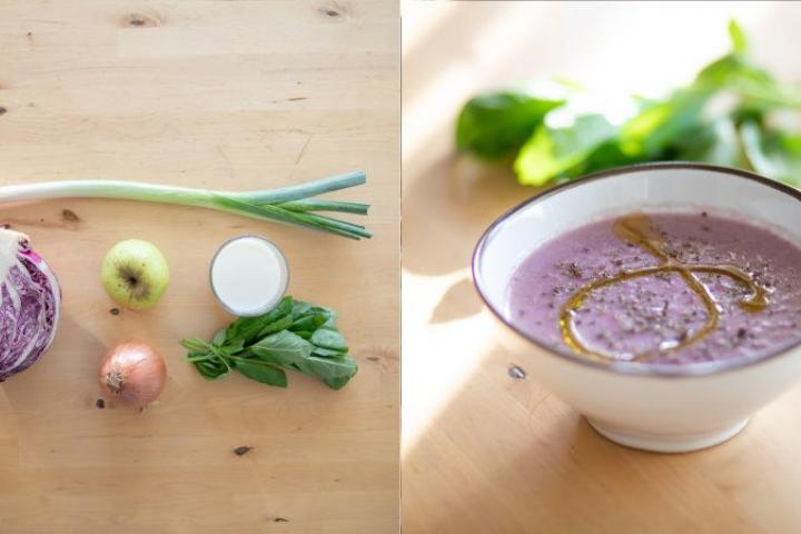 ▶️ Ingredientes (para 3 personas): 1/2 lombarda, 2 manzanas, 2 dientes de ajo, 1/2 cebolla, 2 puerros, 1 vaso de leche, sal, aceite y albahaca