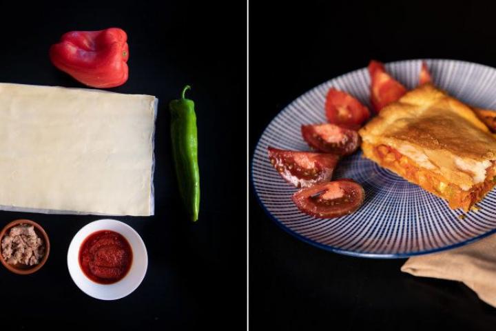 ▶️ Ingredientes (para 2-3 personas): una masa de hojaldre rectangular, media cebolla, medio pimiento rojo y medio verde, tomate frito, una lata de atún, un huevo cocido