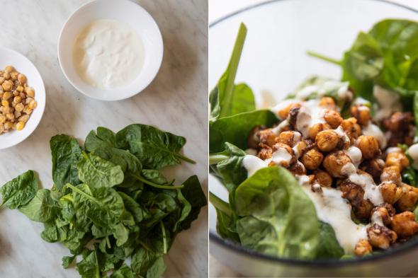 - Monta la ensalada: pon una base de espinacas, añade los garbanzos aderezados y aliña con la salsa de yogur. Si te parece que le falta algo de aliño, rocía con otro chorro más de limón y sal para que las hojas de espinaca cojan más sabor.