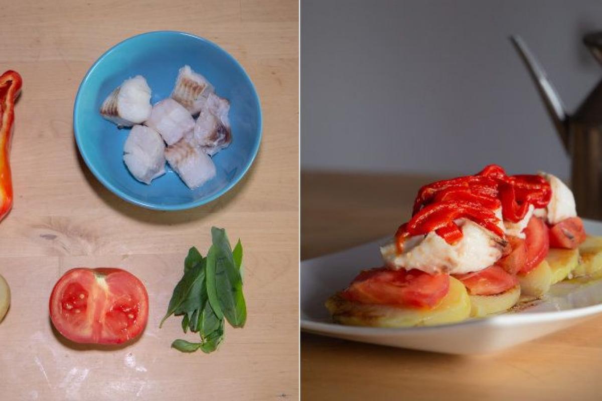 ▶️ Ingredientes: 1 o 2 lomos de merluza, 1/2 pimiento asado, 1 tomate, patata cocida, aceite y vinagre.