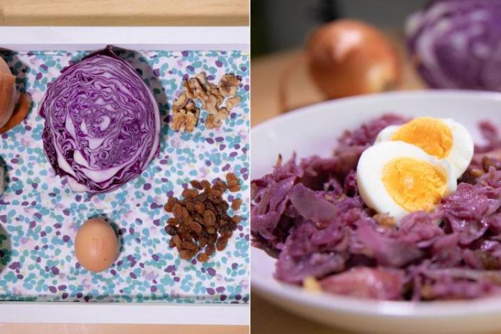 - Lavar la lombarda, cortarla en juliana y cocer en agua con sal. Escurrir y reservar.