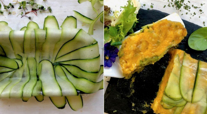 - Con la ayuda de un pelador hacemos tiras de calabacín y forramos un molde de plumcake con ellas.