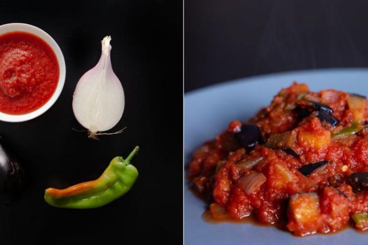 ▶️ Ingredientes (para 2 personas): una lata de tomate triturado grande (de unos 800 gramos), una cebolla, dos pimientos (verdes o rojos), una berenjena, aceite de oliva, sal y azúcar