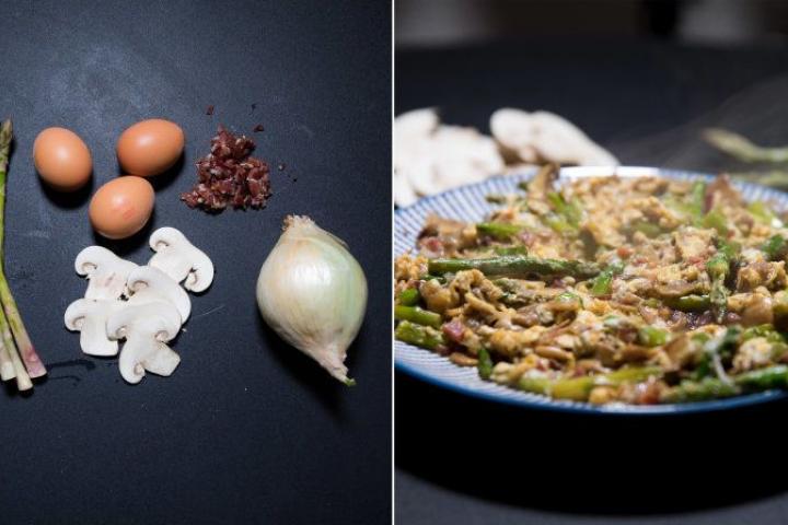 ▶️ Ingredientes (para 3-4 personas): un manojo de espárragos trigueros, champiñones, 3 huevos, un puñado de jamón a tacos, una cebolla.