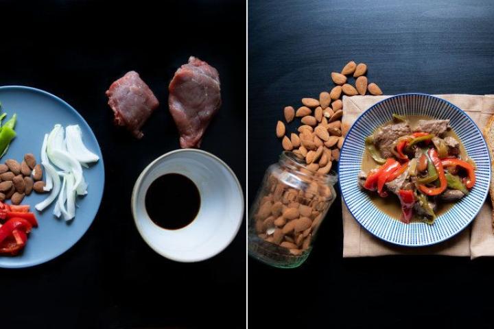 ▶️ Ingredientes (para 2 personas): 450 gramos de ternera cortada, medio pimiento rojo, medio pimiento verde, media cebolla, un puñado de almendras, salsa de soja