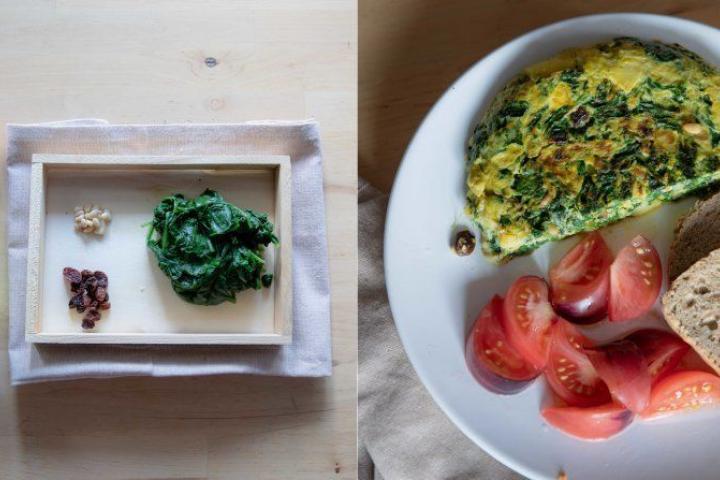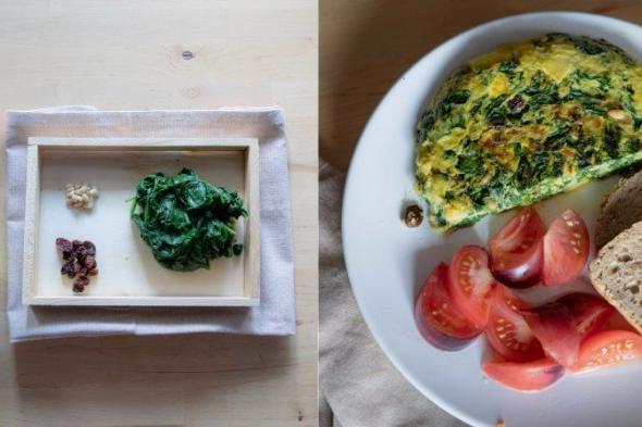 ▶️ Ingredientes: 300 gramos de espinacas frescas, 1/2 manzana, 2 dientes de ajo, piñones, pasas y cuatro huevos.