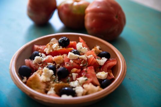 ▶️ Ingredientes (para 1 persona): un par de tomates, una rebanada de pan (en este caso, chapata, un puñado de aceitunas negras sin hueso, un trozo de queso feta desmigado, aceite de oliva, vinagre, orégano y sal▶️...