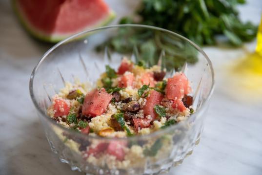 Extraída del libro Vegesanísimo, de Álvaro Vargas▶️ Ingredientes (para 4 personas): 300 gramos de sandía, 125 gramos de cuscús, 125 mililitros de agua, 60 gramos de hierbabuena, 50 gramo...
