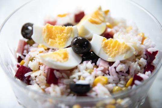 ▶️ Ingredientes (para 2 personas): dos puñados de arroz, un huevo cocido, unos dados de jamón o pechuga de pavo cocido, guisantes, maíz dulce, remolacha cocida, unas aceitunas negras sin hueso. Para aliñar: a...