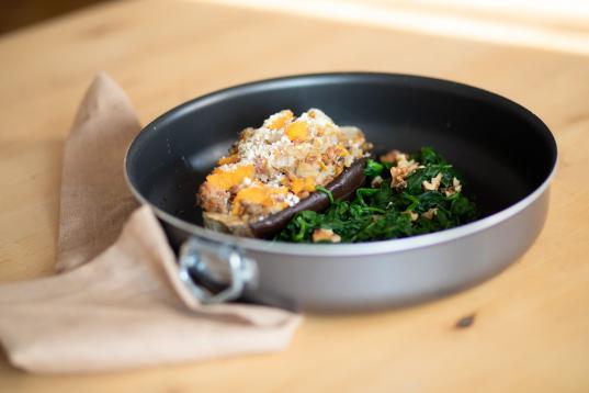▶️ Ingredientes: Una berenjena grande o dos pequeñas, 1 cebolla pequeña, 1 diente de ajo, Medio vaso de quinoa, 1 huevo cocido, 1 lata mediana de atún y salsa teriyaki