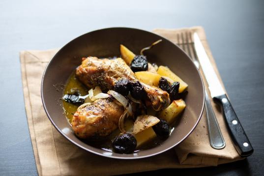 ▶️ Ingredientes (para 2 personas): dos piezas de pollo, media cebolla, una patata, romero, ciruelas, medio vaso de cerveza