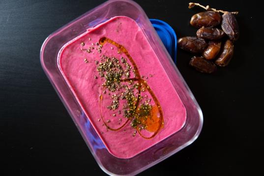 ▶️ Ingredientes: 200 gramos de remolacha cocida, 2 yogures naturales, dátiles, aceite de oliva, un diente de ajo, especias (orégano, tomillo, comino o sésamo) y medio chile rojo (opcional).