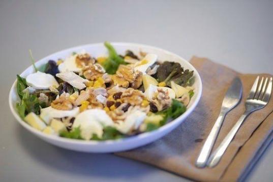 ▶️ Ingredientes (para 2 personas): un zanco de pollo, lechugas variadas, maíz, una manzana, queso fresco, pasas, nueces, aceite de oliva virgen extra, vinagre y sal.