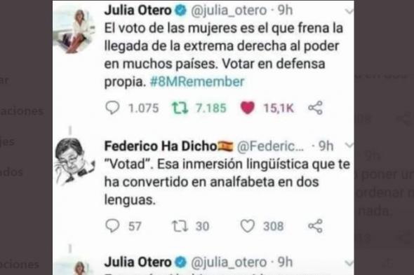 “Votad’. Esa inmersión lingüística que te ha convertido en analfabeta en dos lenguas”, respondió un usuario, que se encontró a su vez con la implacable réplica de Julia Otero: “Eso sería si hubiera querido poner un imperativo. Pero no soy de ordenar nada a nadie. Es un infinitivo. De nada”.