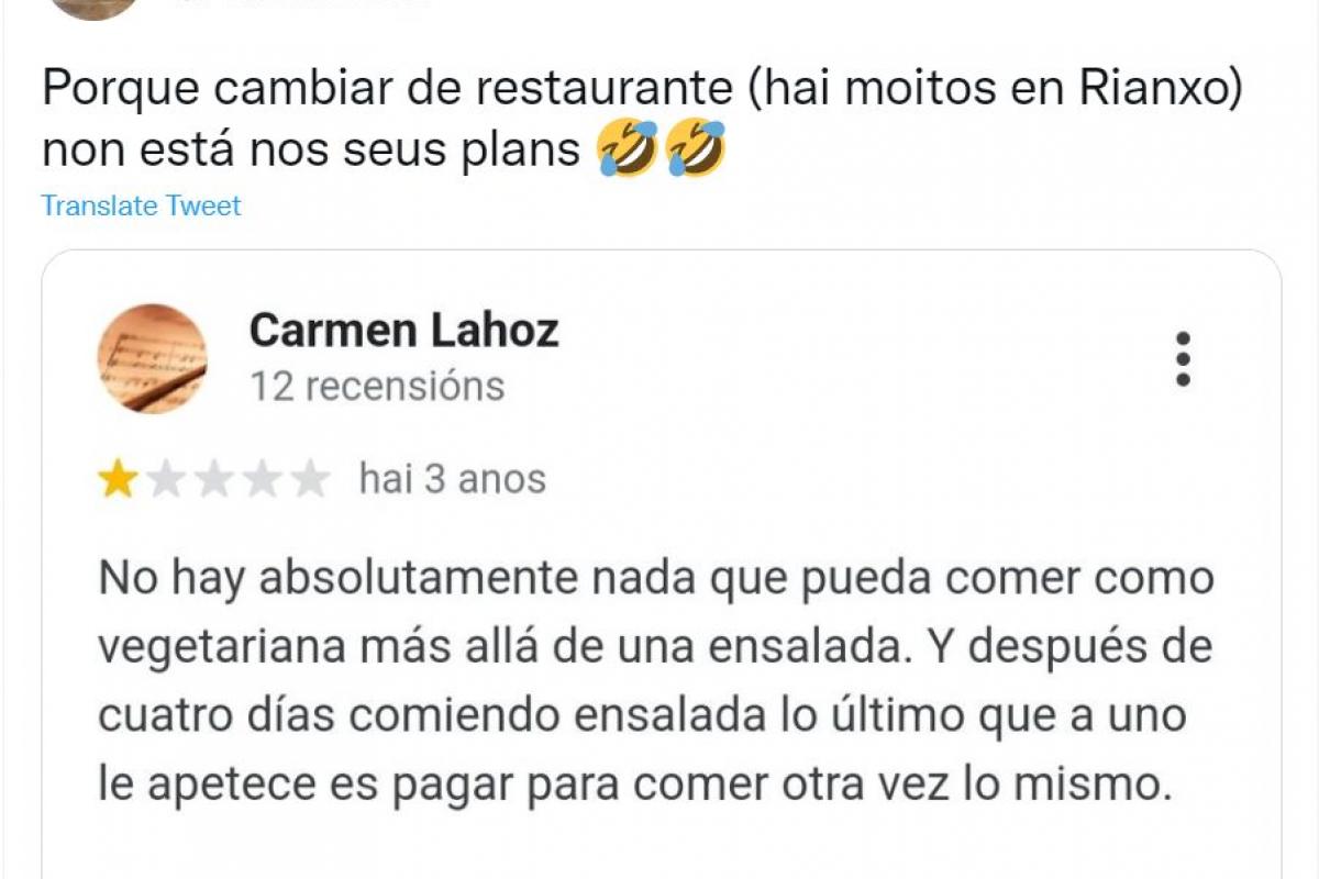 Desde esta cuenta en la red social del pajarito azul han recuperado una mala reseña que dejó hace tres años una mujer tras visitar un restaurante en Rianxo (A Coruña). Se trata de una mujer que se declara vegetariana y protesta asegurando que no dispone de ninguna oferta “más allá de una ensalada”.