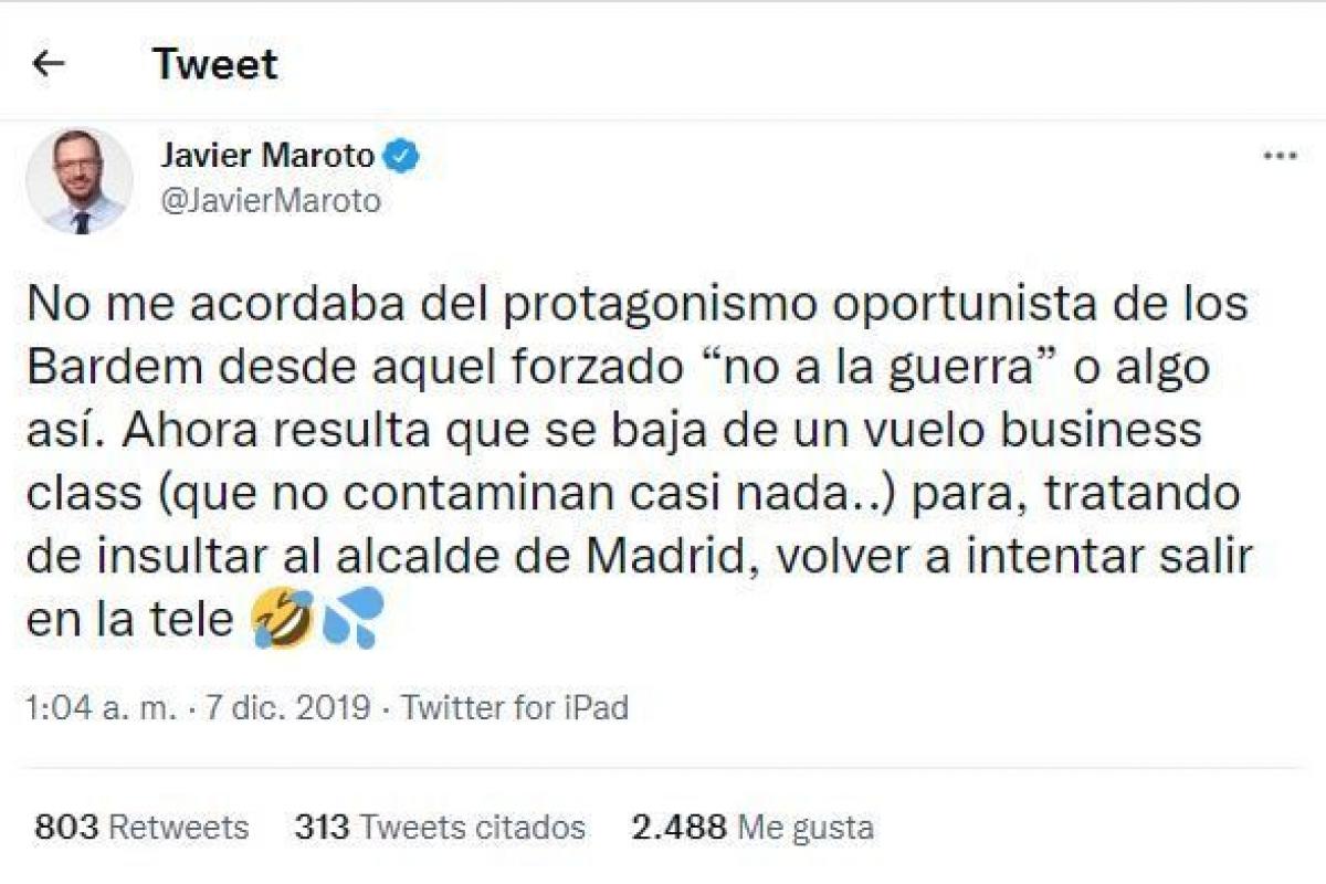 Todo ocurrió hace justo dos años, el 7 de diciembre de 2019, cuando el dirigente ‘popular’ escribió: “No me acordaba del protagonismo oportunista de los Bardem desde aquel forzado ‘no a la guerra’ o algo así”.