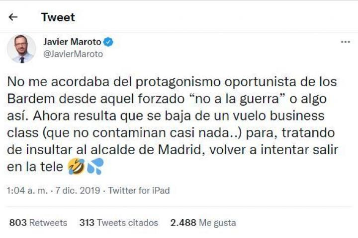Ese mensaje venía a raíz de unas declaraciones del actor Javier Bardem, que en la Marcha por el Clima calificó de “estúpido” al alcalde de Madrid, José Luis Martínez Almeida, por querer revertir Madrid Central.