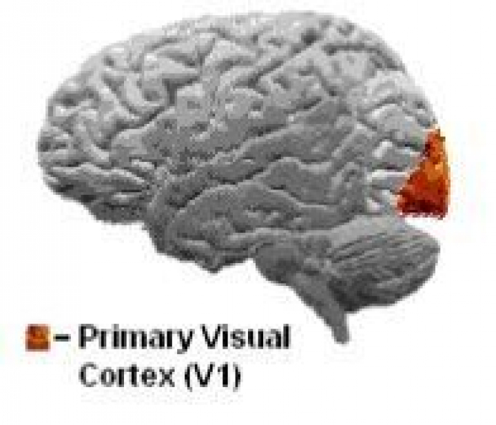 La estrategia consistía en obviar el ojo defectuoso y el nervio óptico que conecta el ojo con la zona del cerebro que procesa la información visual (la corteza visual), ubicada como se indica en la figura en color rojo: