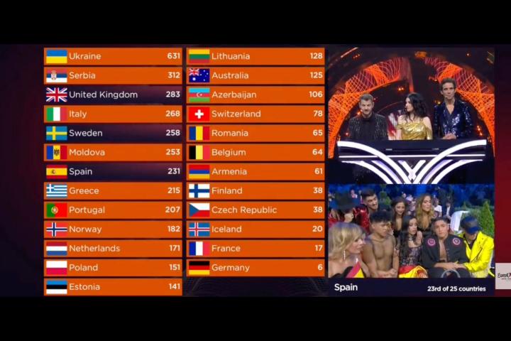 El festival lo ha ganado Ucrania gracias al televoto, sistema por el que se han llevado más de 400 puntos, cosechando así más de 600 puntos y ganando de calle el certamen seguido de Reino Unido y de España.