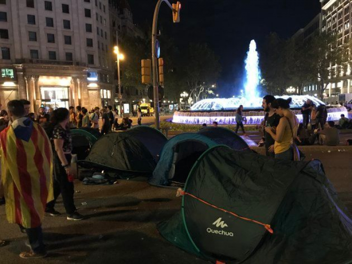 Passeig de Gracia, esquina Gran Via de les Cortes Catalanes. Pasadas las diez de la noche en Barcelona. Unos veinte jóvenes se sientan al borde de la fuente. La calle está cortada. Les alumbran los neones de las vecinos comercios de grandes marcas. Han colocado unas cuantas tiendas de campaña, la intención es quedarse a dormir, una acampada para seguir protestando por la actuación policial del 1-O. Hay confusión, alguna cámara. ¿Puede ser el germen de un nuevo 15-M? A la media hora pliegan las tiendas, se lo han recomendado unos bomberos que han estado en las manifestaciones.