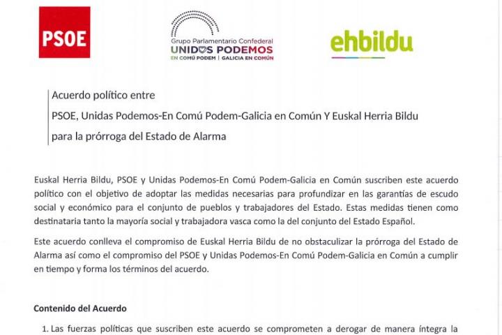 El acuerdo firmado por PSOE, Unidas Podemos y EH Bildu derogaba de manera íntegra la reforma laboral de 2012 a cambio de que la formación abertzale “no obstaculizara” la prórroga del Estado de Alarma.