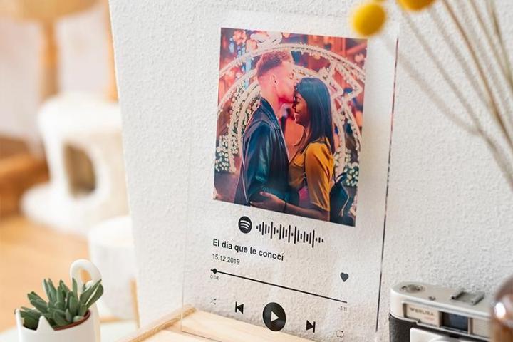 Este producto consiste en una placa que incluye una fotografía significativa para la persona que recibirá el regalo, el título de la canción, los segundos exactos que vas a dedicar y el Spotify Code, para que la persona pueda acceder al tema con un rápido escaneo desde su móvil.