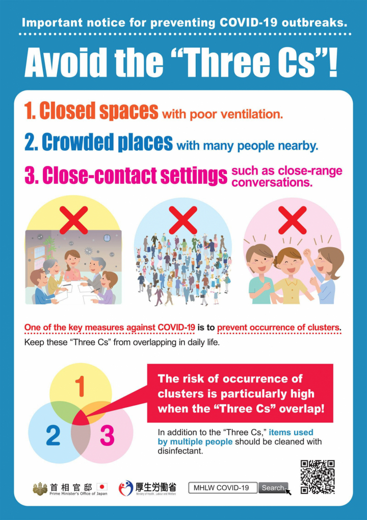 Japón adoptó esta política poco después de estallar la pandemia al darse cuenta de que la mayoría de los contagios se originaban en gimnasios, pubs, salas de música en directo, karaokes y espacios similares en los que las personas se reúnen, comen y beben, charlan, cantan y hacen ejercicio o bailan durante períodos de tiempo prolongados. Muchas veces, sin mascarilla.