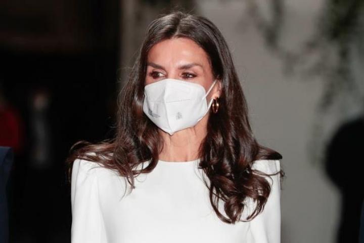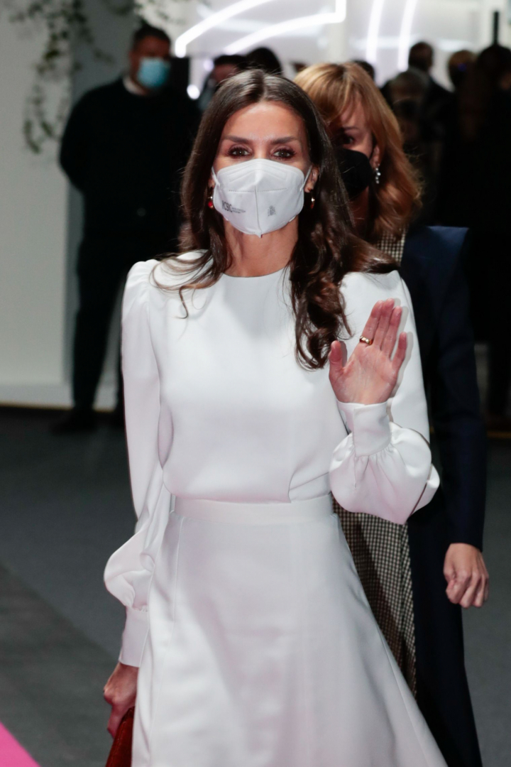 Letizia ha lucido un dos piezas de seda blanca formado por una blusa con cuello caja, hombreras y mangas abullonadas y una falda con dos aberturas frontales.