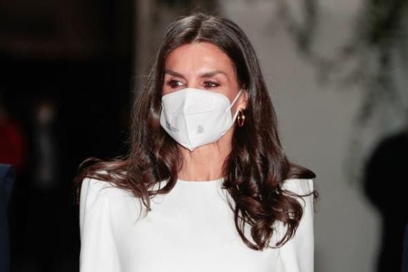 Letizia ha lucido un dos piezas de seda blanca formado por una blusa con cuello caja, hombreras y mangas abullonadas y una falda con dos aberturas frontales.