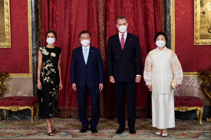 Tras este acto de recepción, los reyes pasaron a la cena de Estado. A las 20:30h recibieron a Moon Jae-in y Kim Jung-sook en el Salón de Teniers del Palacio Real. Entonces, llamó la atención la mascarilla de los representantes coreanos, con una bandera de España y otra de Corea, como símbolo de su encuentro.