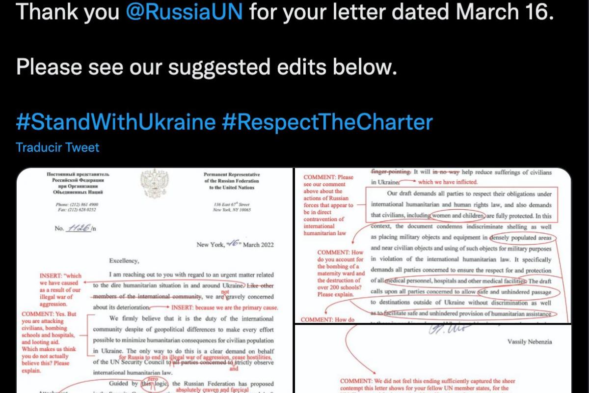 Con anotaciones en rojo como si de un ejercicio de colegio se tratara, los responsables de la misión permanente de Canadá en la ONU han respondido a las solicitudes de Rusia para que los aliados occidentales respeten sus obligaciones humanitarias, sugiriendo que es la propia Rusia la responsable de que sea necesaria esa ayuda.