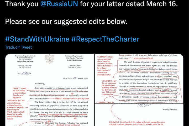 Ya en el inicio, Rusia expone: “Me comunico con ustedes con respecto a un asunto urgente relacionado con la grave situación humanitaria en Ucrania y sus alrededores.” A lo que Canadá añade en rojo: ”...que hemos causado nosotros como resultado de nuestra guerra ilegal”.