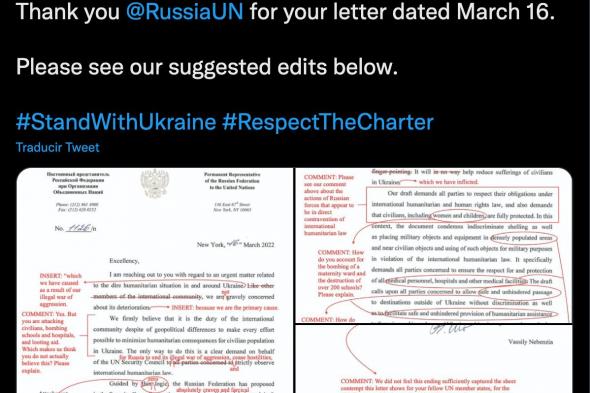 Con anotaciones en rojo como si de un ejercicio de colegio se tratara, los responsables de la misión permanente de Canadá en la ONU han respondido a las solicitudes de Rusia para que los aliados occidentales respeten sus obligaciones humanitarias, sugiriendo que es la propia Rusia la responsable de que sea necesaria esa ayuda.