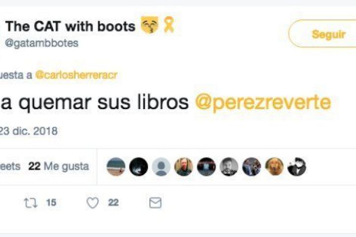 El usuario @gatambbotes respondió a la fotografía citando a Pérez-Reverte y con esta amenaza: "Voy a quemar sus libros".