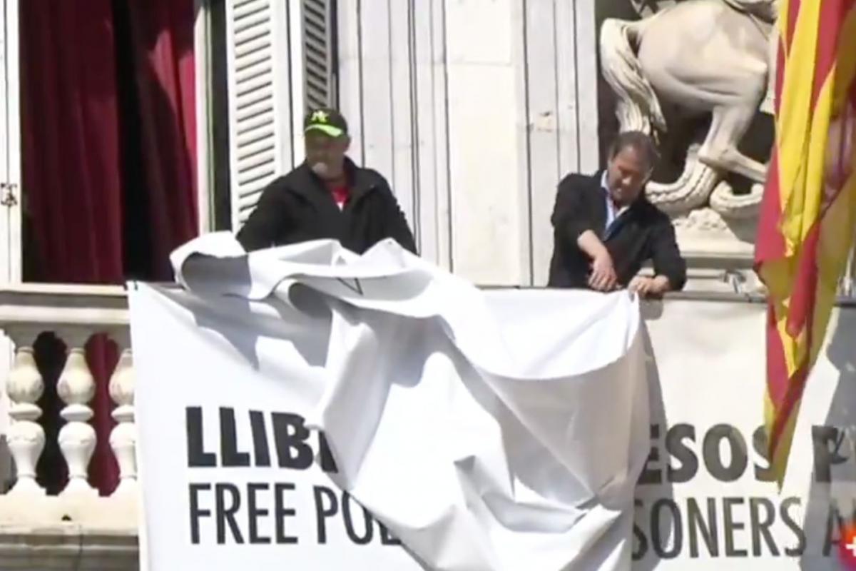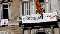 La pancarta a favor de los “presos y exiliados”, con el lazo blanco y la franja roja, que colgaba desde ayer jueves del balcón del Palau de la Generalitat, ha sido retirada este viernes al filo de las 12.30 horas.