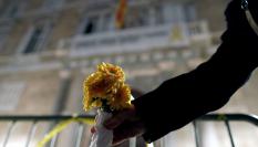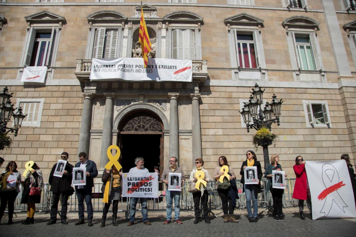 A las 11.45 un grupo de unas 25 personas portando una pancarta que rezaba “Libertad presos políticos” se han detenido frente a la Generalitat, han entonado Els Segadors y se han marchado.