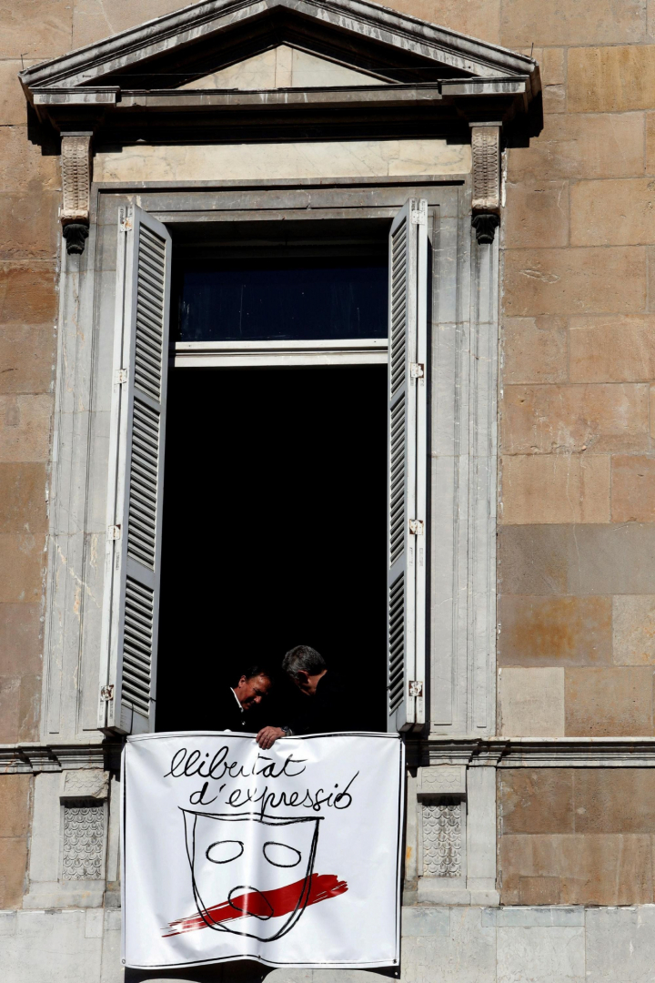 Los funcionarios también han retirado una pequeña pancarta colgada en una de las ventanas del Palau junto al balcón con el lema “Libertad de expresión” y la característica careta con la franja roja cruzando la boca de la máscara.