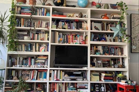 Hinds ha subido la foto de una estantería llena de libros y otros objetos decorativos como bolas del mundo, plantas, piedras y dibujos.