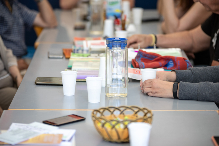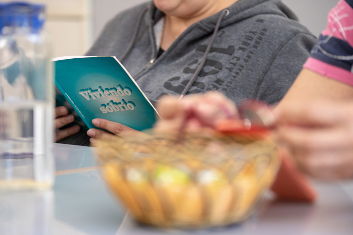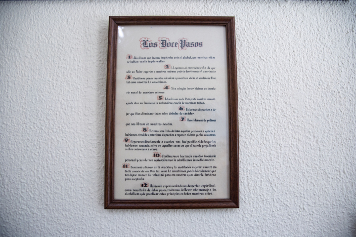 Entre termos de café y jarras de agua, da comienzo la reunión con los miembros sentados alrededor de una mesa alargada. Como en una junta al uso, antes de dar la palabra a los participantes, se leen las 12 tradiciones y los 12 pasos de A.A., además de un fragmento del libro Viviendo sobrio, una de las obras publicadas por Alcohólicos Anónimos en los años 70 que el grupo sigue utilizando a día de hoy.