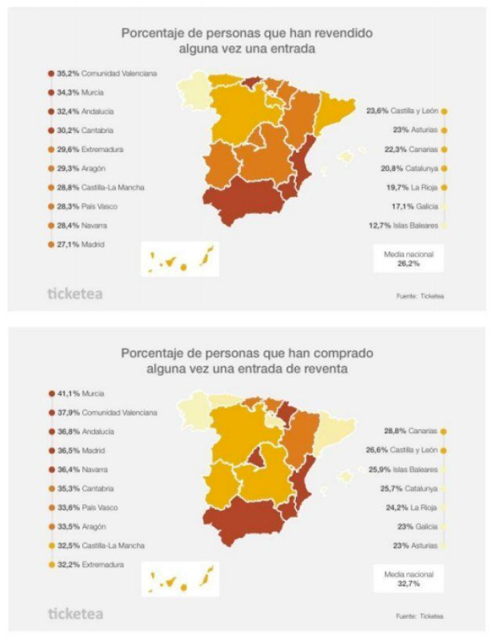 - Por el contrario, Cataluña, Galicia, Islas Baleares, Asturias o La Rioja son las comunidades en las que menos gente compra entradas de reventa.