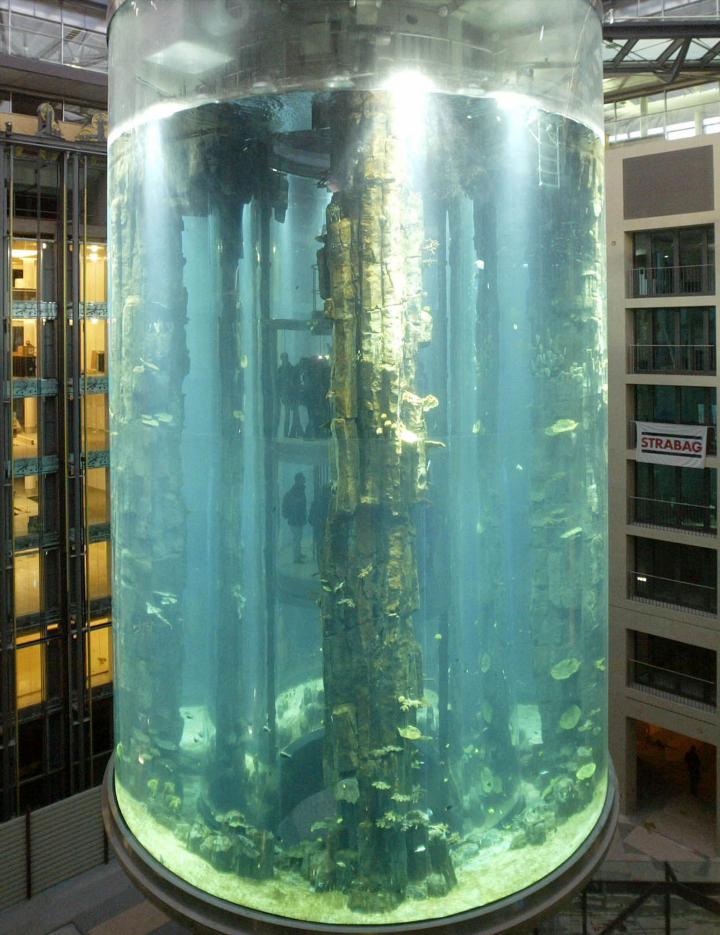 El AquaDom, el acuario cilíndrico más grande del mundo, ubicado en el interior del hotel Radisson Collection de Berlín, reventó esta mañana por razones que todavía se desconocen, vertiendo dentro del edificio y hacia la calle un millón de litros de agua y 1.500 peces tropicales.