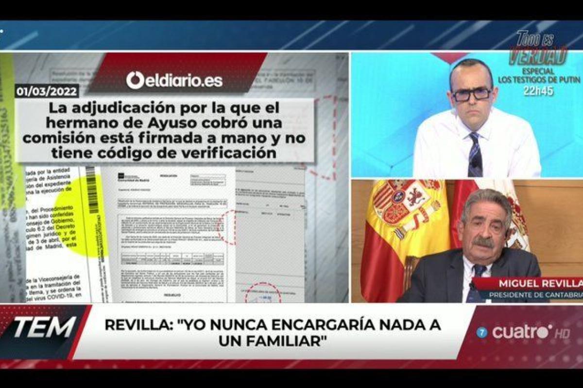 En el programa Todo es Mentira de Cuatro, Revilla ha criticado que el Gobierno de Isabel Díaz Ayuso hiciera un contrato con el hermano de la presidenta de la Comunidad de Madrid, aunque esa operación no tenga por qué ser ilegal. “Todos tenemos hermanos, hijos, nietos, primos y demás familia, pero no se me ocurriría en la vida hacer contratos con familiares, incluso de segundo y tercer parentesco”. En Cantabria “saben mis familiares que no pueden concursar para ningún contrato”.
