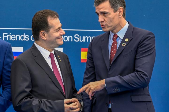 Ludovic Orban, primer ministro de Rumanía, y Pedro Sánchez, presidente de España, charlan durante la cumbre de los Amigos de la Cohesión en Portugal, el 1 de febrero de 2020.Corbis via Getty Images