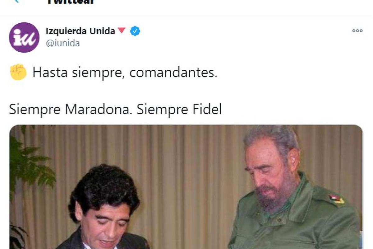 La cuenta de Twitter de Izquierda Unida se ha sumado al homenaje con una foto en la que aparece junto al dictador cubano Fidel Castro. “Hasta siempre, comandantes. Siempre Maradona. Siempre Fidel”, ha escrito el partido político en la red social.